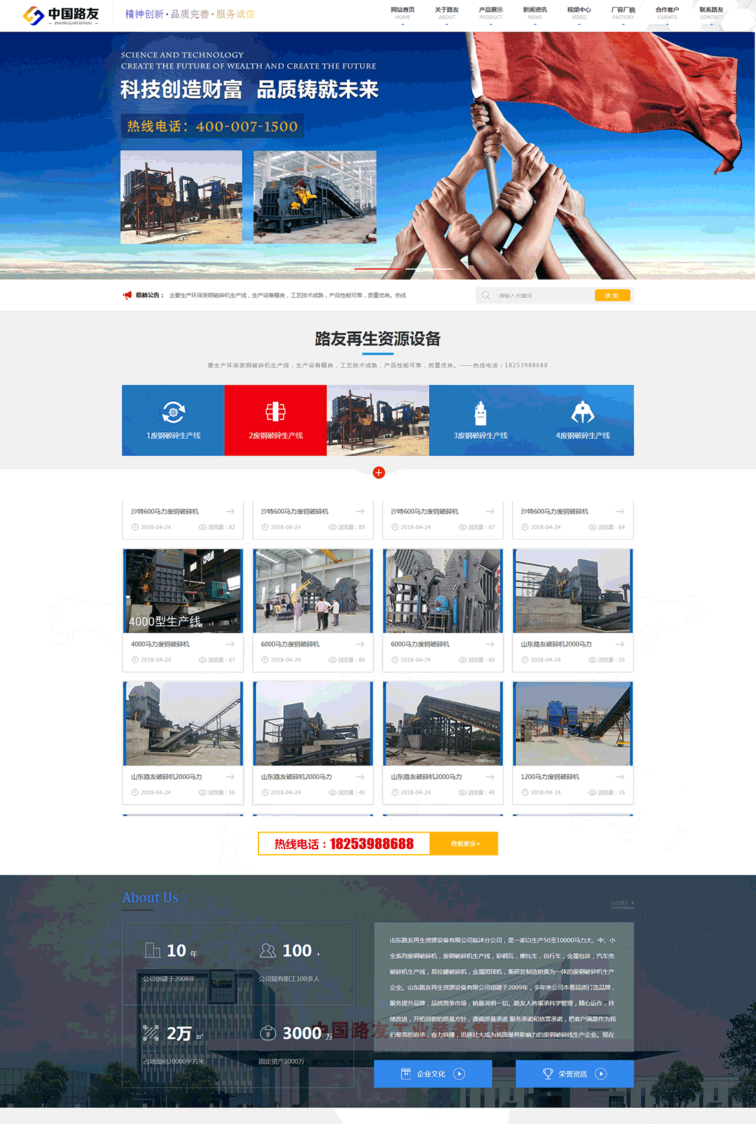 山東路友再生資源設備有限公司臨沭分公司主要生產環保廢鋼破碎機生產線,彩鋼瓦,摩托車,自行車,金屬包塊,汽車殼破碎機,易拉罐破碎機,油漆桶破碎機,鑄鋼(如:汽車發動機,機體等)破碎機,金屬打包機,壓塊拆包機,廢紙打包機,500-2000噸龍門剪刀機,削片機,生鐵銷壓塊機,熟鐵銷破碎機,對輥式破碎機,大 中 小環保除塵器等100多個品種廢鋼加工,分解設備。
